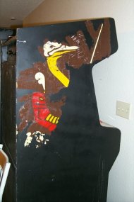 On the 25th, I spent an hour and a half finishing the left side of my Joust. The heat gun does work wonders but as you look at the picture you will see that its not perfect. It does work A LOT better than Strippers and is a lot more cost effective. In fact, if I wanted to strip a game completely, I think I would use a heat gun now. It works really well with Latex paint, and even works with the other types of paint too (That's one of the draw backs ). If you look closely you will see the areas where I heated it up too much and it melted the original paint as well. You should also be able to see the scrap patterns below the bird. One of the problems that I found is that the paint from the scraper would some times stick to another part of the side and cause it to look bad. You really can't heat it up again and scrap it off since you don't have that much protecting the original Art. Another issue that I ran into was that I had to stop quite a bit and clean off the putty knife that I was using to scrape off the paint with. The putty knife should be as clean as possible in order to prevent you from leaving paint behind or not scraping paint off at all. The most successful technique that I found was to run the heat gun back and fourth over the area I intended to scrape in order to warm it up. I then moved back to the starting point and started heating it to the point that the paint would bubble up. I then scrapped in a single motion with the heat gun slightly ahead of the putty knife, causing the paint to bubble up in front of it.